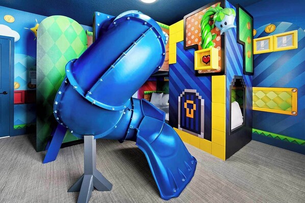 (4 Twins) The fun and games continue (literally) in this incredible ‘Gamer’s Paradise’ themed bedroom, custom-designed to look like the kiddos’ favorite video game come to life! The walls and ceiling are a deep sky-blue, dotted with emoji-like white clouds. Each of the two bunk beds features life-sized video game elements, including tunnel-like doorways, giant golden coins, and blocky cartoon characters racing through pipes and tubes as they attempt to win the game. Be forewarned: come bedtime, it’ll be hard to say ‘game over’ in this space!