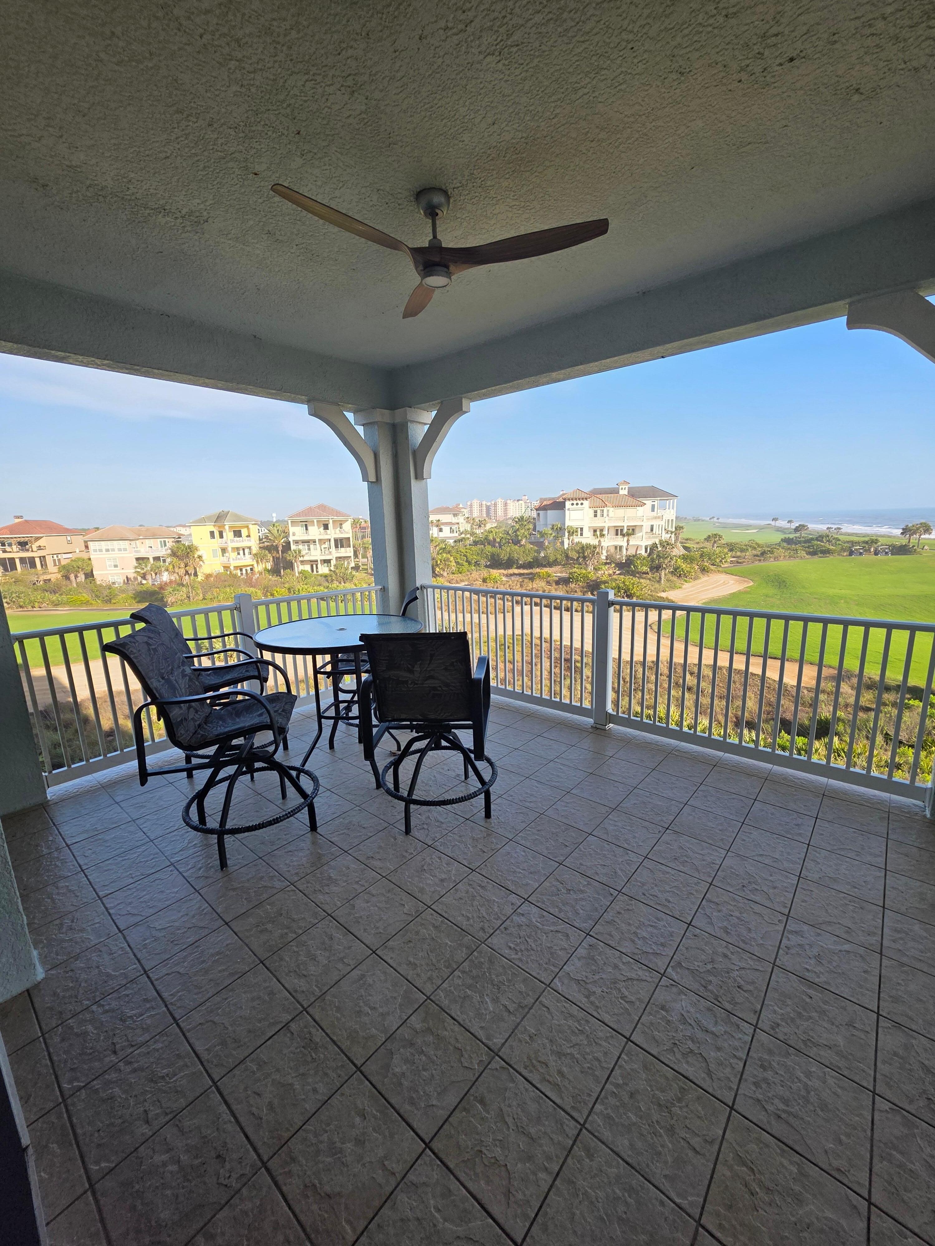 Amazing views of the ocean and golf course. Large balcony with a table to eat and lounge chairs. The condo was very clean, lots of room for 3 adults. Could easily accommodate more people. Kitchen was well stocked if you plan to cook. Beach access is right next to the building and the pool area is a 5 minute walk. There are 2 pools, plus a kiddie pool and splash area. The pool cafe was closed for the season (closed after Labor Day). Grocery store (Publix) is nearby. Lots of restaurant options in Palm Coast or Flagler Beach. We loved Bronx House Pizza.