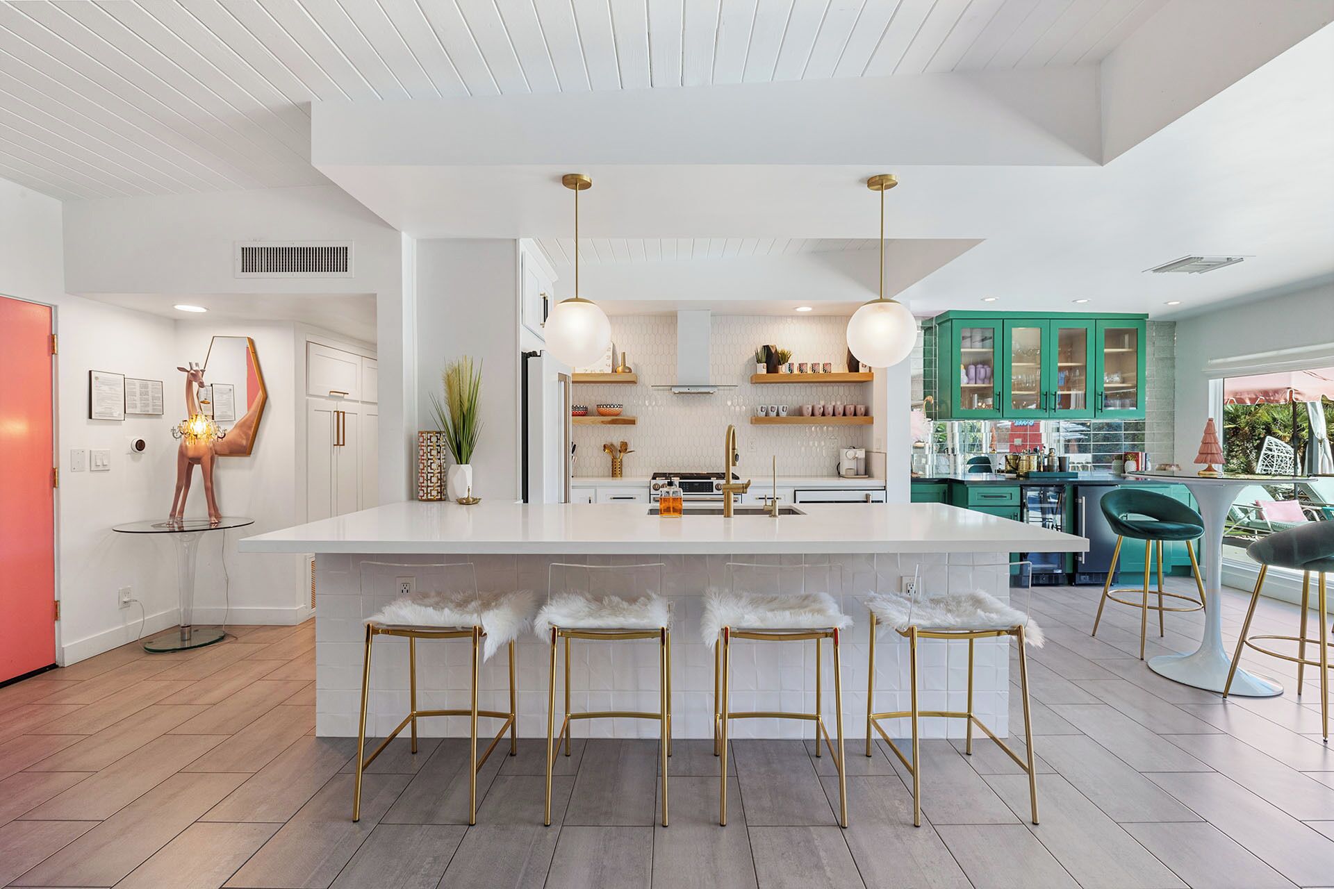 The second bedroom is no less spectacular, with its bright aqua mid-century wallpaper and other decor touches, plus king bed with luxurious mattress. The room also provides a dresser plus wall-mounted TV, and is located right next to the central bathroom which has to be one of the most incredibly fun restrooms you will ever see. Its desert-inspired pink and green wallpaper is the perfect contrast to its super slick finishes, from its vanity to the the mosaic tile surrounding the shower and bath.