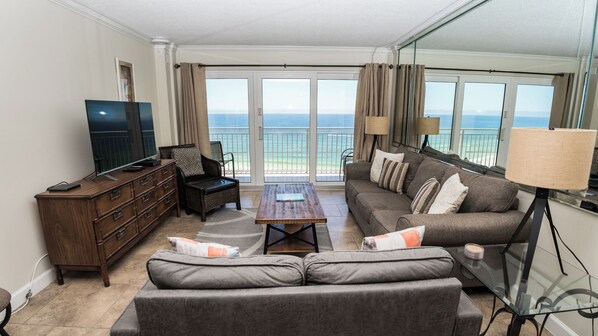 Le salon a une télévision à écran plat / câble et lecteur DVD, un canapé a un canapé-lit queen size et des portes coulissantes en verre qui mènent au balcon.