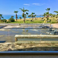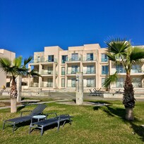 Plezier met het hele gezin op het strand, met een buitenzwembad, dicht bij Haven van Paphos