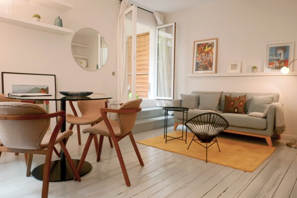 The apartment was perfect for our stay in Paris. The apartment was right on a busy street, but set back far enough to not feel like you were overwhelmed by noise. The apartment had plenty of space, with some very thoughtful decorations and amenities. The small outdoor space was perfect to unwind after a day of sightseeing.