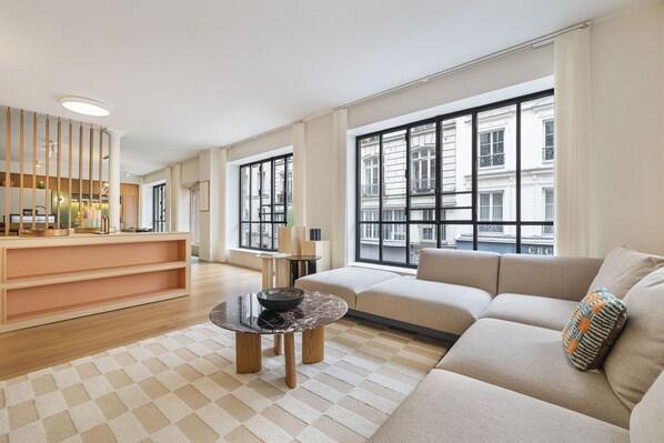 Exceptionnal 3 bedrooms apartment, 120 sqm, on the first floor without lift, overlooking the street and a litte courtyard. Access form the street through a private entrance. Inside stairs to first floor. The apartment consists on: