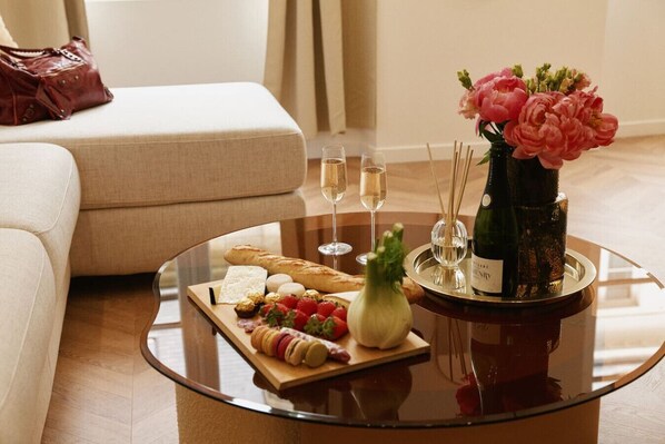The apartment features two separate bedrooms, each with a double bed, and a sofa bed in the living room. The latter being a bright, inviting area flooded with natural light from large bay windows overlooking the Cognacq-Jay Museum.