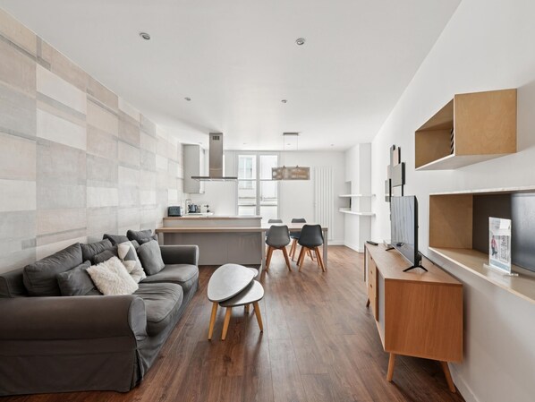 The heart of the apartment is a bright and spacious living area, designed for relaxation and shared moments. It features a comfortable lounge with TV, a dedicated dining area, and a fully equipped open-plan kitchen (hob, oven, extractor hood, dishwasher, refrigerator, coffee machine, toaster and storage). Warm wood tones, clean lines and contemporary finishes create an elegant and soothing atmosphere.