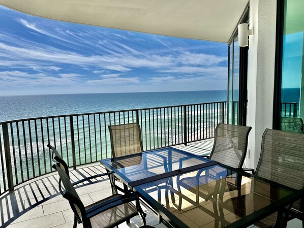 This unit features HUGE floor to ceiling views of the Gulf from the living areas and patio! In addition to these amazing views, the living room features a flat screen television and a queen-sized sofa bed which allows this unit to sleep a total of 8 people! The fully stocked kitchen (including a Keurig coffee maker) features a breakfast bar for convenient eating space for 3. The dining table overlooks spectacular gulf views and will serve 6! The spacious, tiled balcony also features outside dining space and lounging space as well!