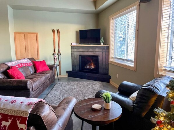 Walk into the open concept living room, dining room and kitchen with high ceilings and modern finishes. This suite is beautifully decorated and has everything you need to enjoy your stay. It has a smart TV with the focal point being the large gas fireplace.