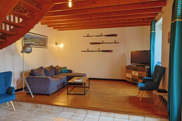 Attenant à la cuisine, sur un parquet chaleureux, le salon vous accueillera pour un moment de détente, propice à la lecture ou à la télévision.
