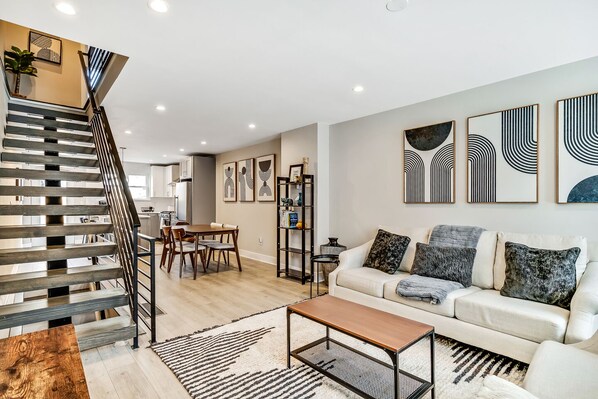 Exceptional newly updated downtown Philadelphia townhome! This stunning property spans 4 floors and offers a luxurious and comfortable stay. Multiple outdoor spaces including a private patio, balcony & spacious roof deck. Each floor of this home has been thoughtfully designed & furnished to provide both style & comfort. 5 bedrooms (4 rooms + basement with a sleeper sofa), 3 full bathrooms, the property can comfortably accommodate large groups families, and traveling business partners alike!