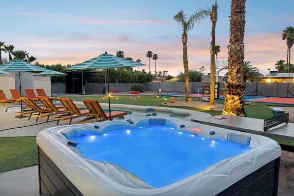 The fun doesn’t stop indoors—Fairway Oasis's ultimate backyard takes outdoor living to the next level! Start your day relaxing on the covered patio or soaking up the Arizona sun by the sparkling pool. If you’re feeling competitive, grab an opponent for a game of bocce ball or cornhole, or go big with life-sized cup pong. Sports lovers can head to the sports court, which offers a basketball hoop, a pickleball net, and a wide array of equipment for all your favorite games. The putting green is perfect for golf enthusiasts. You can even fine-tune your golf swing at the practice cage before hitting the green at one of Scottsdale’s famous courses. For some well-deserved relaxation, take a dip in the hot tub or gather around the fire pit.