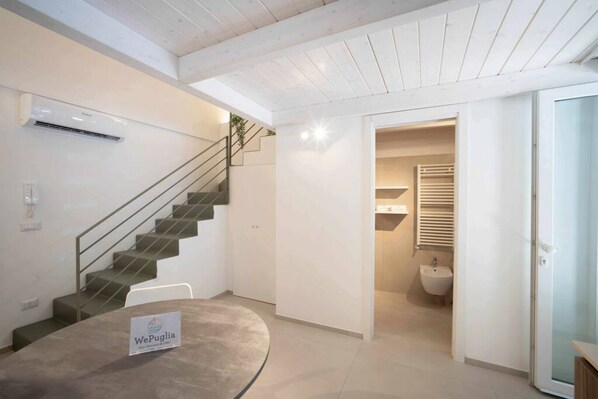 Suite Piazzetta is a recently renovated ground floor loft studio apartment. Inside the house there is a kitchenette with 2 gas burners, sink, oven, refrigerator, table with chairs, washing machine, a bathroom with shower, and on the mezzanine there is a double bed. The accommodation has barrel vaults.
