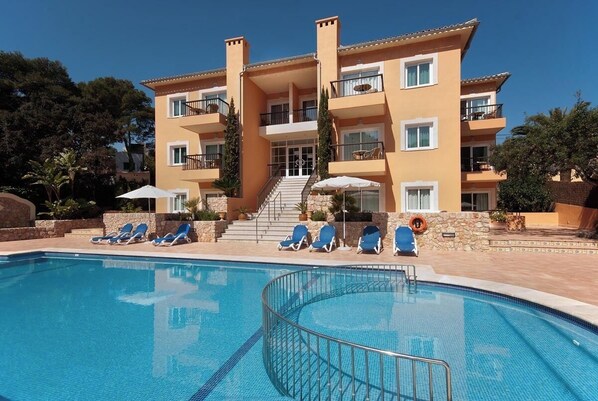 A large swimming pool with a secured children's pool is surrounded by a spacious terrace and plenty of sun loungers with umbrellas.