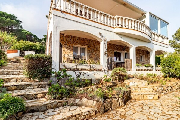 Large terrace with sea views and garden area with outdoor shower.