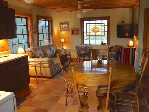 Recently updated, this house is comfy, cozy and quiet! You will love this nicely decorated and well maintained unit! Excellent for couples with one queen in each bedroom and a leather couch in the living area. The downstairs efficiency includes 1 Queen and a Twin over Full Bunk, kitchen, dining area and bathroom. Outside, enjoy the great BBQ area with its stone work floor and the mature oak trees on the sprawling deck! Feels like home nestled in rare mature trees. Note this unit has Spectrum Television and Streaming Options so you can sign in with your own personal streaming services using the Spectrum Wifi at the home. The Leiker House rental includes both the Up and the Down parts of the home.