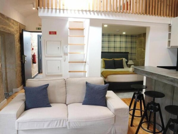 This mezzanine apartment adds a special touch of character, serving as a peaceful and cozy retreat — ideal for reading, unwinding, or simply slowing down.