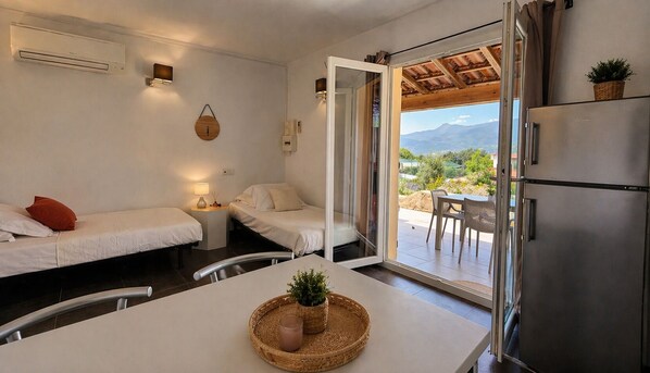 - D’une belle terrasse de 10m2 offrant tous les soirs un coucher de soleil à couper le souffle face aux montagne et à la piscine. - Une chambre avec lit double "Queen size" (160 cm), - Deux couchages dans le salon composé de deux lits simples 2x (90 cm) et/ou d'un lit double (180cm), - D’un séjour de 20m2 avec sa cuisine dite à l’Américaine bien équipée (lave vaisselle, etc…). - D'une salle de bain équipée d'une grande douche et d'un WC, - D'un téléviseur HD, - Connexion WIFI, - Une place de parking dans la résidence.