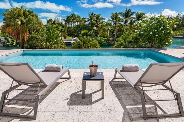 Located on an expansive prime corner lot like no other, Legacy Villa enjoys both sunrise, full-day sun, and sunset as it wraps around an approximate 400’ of turquoise canal and full-length dock frontage.