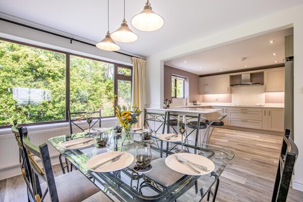 - rear dining room area - stylish metal framed dining table with 6 chairs and coordinating dresser