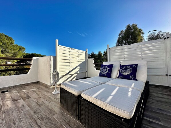 On the first floor you will find an bedroom with 2 single beds or double beds, have a panoramic terrace included chairs, table and deckchairs where you'll be able to admire the night sky and have a private area to relax in the day.
