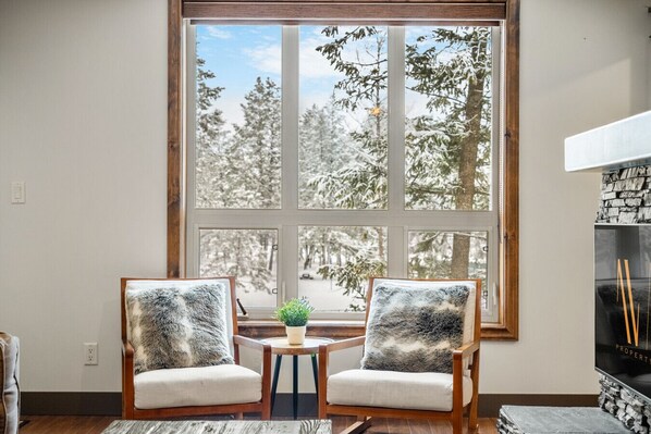 The living room features a 43` smart TV with cable. Cozy up to the fireplace, watch a movie, or grab the board games for a little friendly competition.