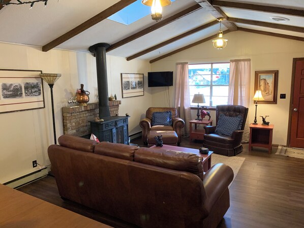 The home has a full-service kitchen that opens up to the living room, where you’ll find a wood burning stove to keep you toasty on those cool summer nights and chilly winter days.