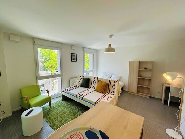 - Central Location: In the heart of Reims. - New Building: Modern and secure. - Furnished Studio: Comfortable and ready to welcome you. - Flexible Rental: Short, medium, and long term. - All Bills Included: Water, electricity, internet, elevator. - Accessibility for People with Reduced Mobility (PRM): Adapted for people with reduced mobility.