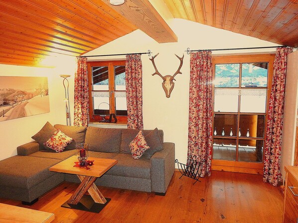 Unsere idyllische mit dem natürlichen Charme von Naturholzmöbeln eingerichtete Drei-Raum-Wohnung "Almgenuss" mit 65 m² Wohnfläche lässt keine Wünsche offen. Ein stilvoller Wohnraum mit Naturholzboden, großen Wohlfühlsofa, schöner großer Essecke und Flachbild-TV, sowie 1 extra Mansarden-Schlafraum mit Doppelbett und 1 extra Mansarden-Schlafraum mit 2 Einzelbetten sorgen für ein hohes Maß an Gemütlichkeit. In der bestens ausgestatteten Küche mit Spülmaschine, 4-Platten-Herd, Backofen, Kühlschrank mit Gefrierfach, Kaffeemaschine, Wasserkocher und Toaster finden Sie alles, was Sie zum Zubereiten Ihrer Urlaubsschmankerl brauchen. Ein neues modernes Bad mit flauschigen Hand-/Duschtüchern und Fön sowie ein extra Raum für´s Gepäck und ein großer lauschiger Balkon mit Mittag- und Abendsonne und traumhaften Bergblick erwartet Sie...
