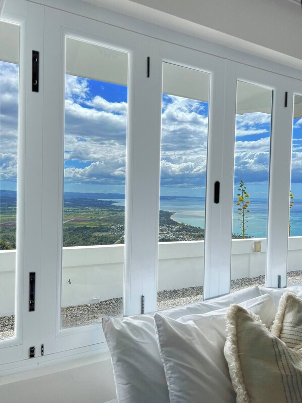 Outdoors: Panoramic views from infinity pool, lounge & gazebo areas for Ocaso Luxury Villa guests. Outdoor cascade shower & bathroom are a plus.