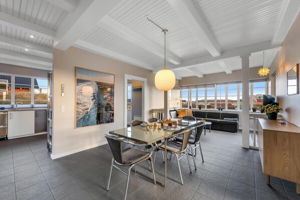 Outside, you can enjoy the fantastic view from the balcony, or relax on the screened-in terrace, where there is also a barbecue available. The outdoor hot tub is an added luxury, accommodating up to 6 people, so you can relax under the stars after a long day. On the highest part of the house's grounds, can you enjoy the dune landscape and experience the fantastic sunset.