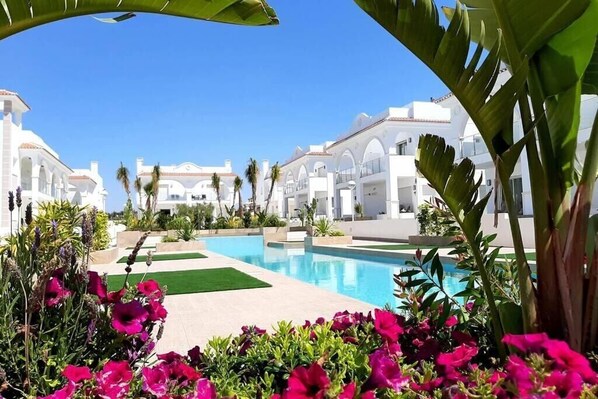 ALLEGRA is a stunning 2 bedroom, 2 bathroom apartment (sleeps 4) with large garden plot situated in the new exclusive Allegra complex in Doña Pepa, Ciudad Quesada. The complex offers a big resort style swimming pool surrounded by beautiful gardens. The property is ideally situated short walking distance to the Quesada main high street with plenty of bars, restaurants, suprmarkets, shops.. Equipped with full air-conditioning (hot/cold) throughout all the apartment, internet/WiFi and more.