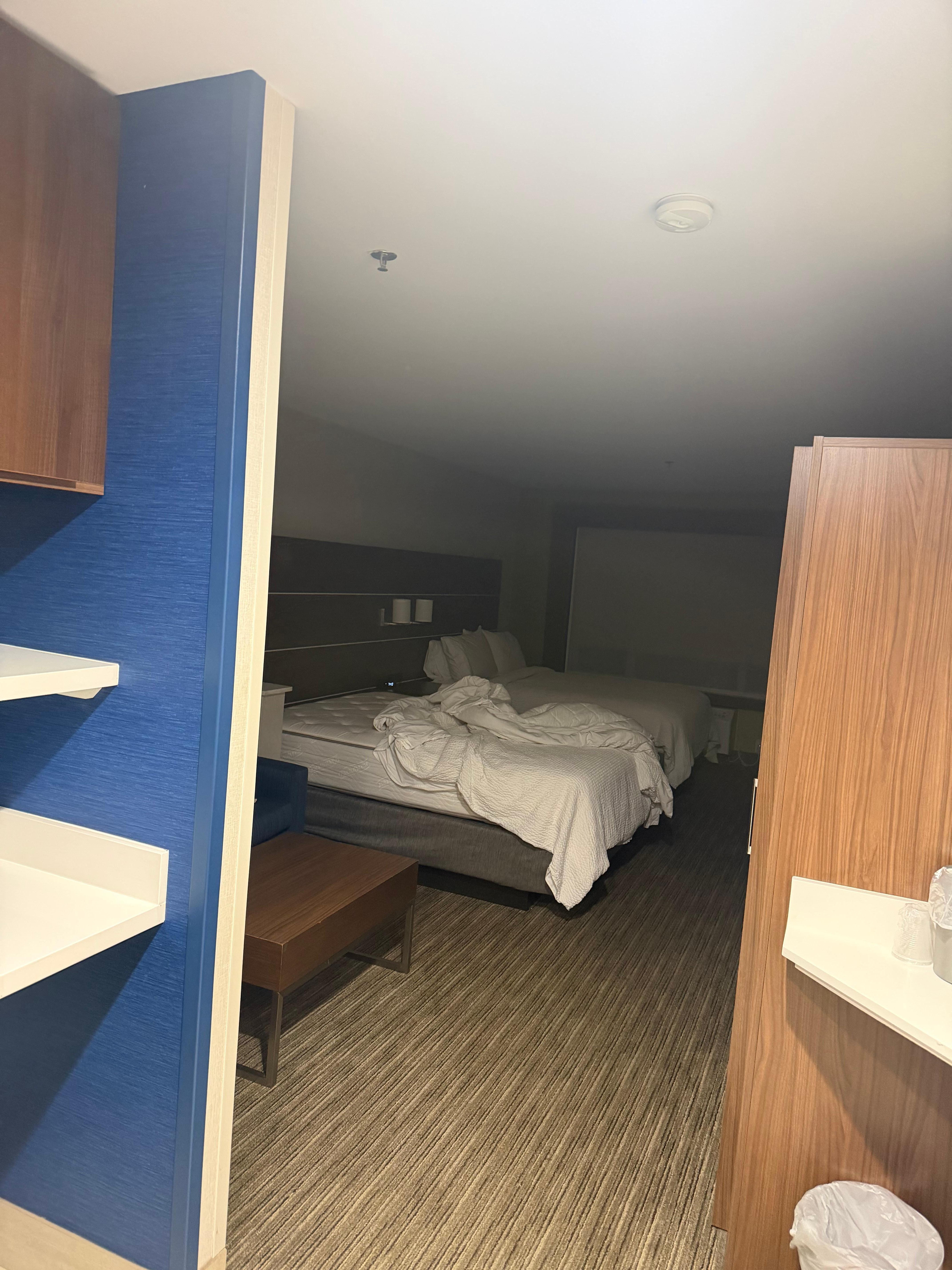 The room was very disappointing. The room is old. There were ants in the bathroom, carpets need cleaning, walls need scrubbing (red stains splattered throughout), outlets not working by the television , and the thermostat on the wall did not control the temperature. You can hear the other rooms doors slamming all hours of the evening. You can also hear other occupants through the walls/ceiling and walking around. It was spacious which was nice! We only stayed about 15 hours otherwise I would have left.