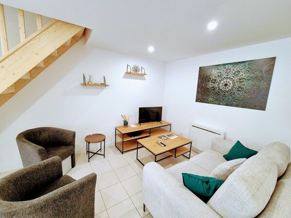 -> D'un salon avec un canapé une table basse accompagnée d'une TV ! WIFI à disposition.