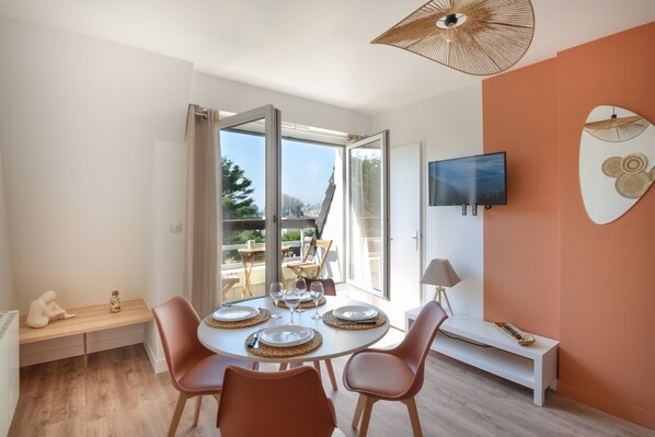 - 15 m² living room with TV, double sofa bed and dining area