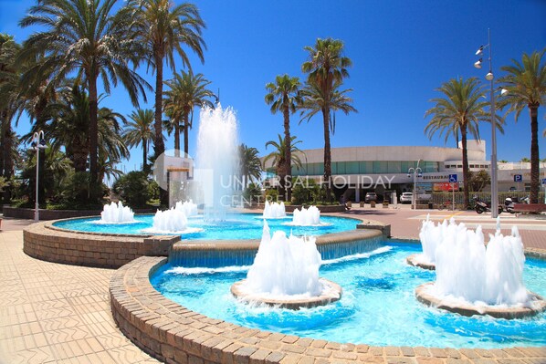 The UHC CENTER I complex has a privileged front-line location, right in the centre of Salou, in front of LLevant beach, the main beach of Salou, where you can enjoy your holidays to the full. This beach offers all kinds of services such as showers, toilets, beach bars on the sand, beach umbrella and sun lounger hire, children's playgrounds and disabled access. Bordered by the great Paseo Marítimo Jaime I, it is a fantastic place full of palm trees, a labyrinth of fountains where children and adults bathe and refresh themselves at all hours, children's playgrounds, ice cream parlours and much more. If you like lively places, you will love it!