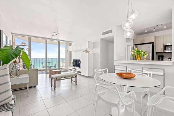 Enter the apartment, and you are greeted with beautiful beach and ocean views as you look across the dining room, living room, and balcony.  The dining room comfortably sits 4 adults and has a convenient opening to the kitchen counter so you can serve meals buffet style, also sits 2 additional guests at the kitchen countertop. The living room has a flat-screen TV with both English and Spanish channels.