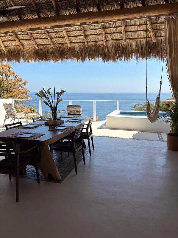 The main living area of Casa Milagro is comprised of an open-air palapa projected over a cliff offering panoramic views of the Oaxaca coastline and beautiful Pacific Ocean. The living space is flexible and comfortable, offering built-in sofas, armchairs, hammocks, and lounge chairs. Overheard fans are present in every room offering continuous, fresh airflow. Customizable Accent lighting lets you change the atmosphere to your moment in this space and Bluetooth speakers are available to ensure the vibe is met. This space offers the versatility to configure itself to your desires and can also serve as a dance and/or yoga studio. Additionally, a queen-size Murphy bed transforms this space at night into an additional sleeping space. The outdoor balcony offers a gorgeous open-air space accompanied by Casa Milagro’s unique offering, our private pool shimmering at the edge of the deck looking over the cliff and out to infinity.
