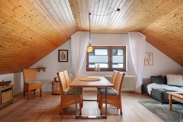 This vacation apartment has two cozy bedrooms, a fully equipped kitchen with a large dining table, as well as a bathroom and WC. From the attractively designed living room with satellite TV, internet connection and telephone, you have direct access to the spacious terrace, which invites you to linger in a healthy and pleasant Black Forest atmosphere. Our apartment is rated according to the DTV classification and awarded 4 stars. (DTV = German Tourism Association). Dogs allowed.