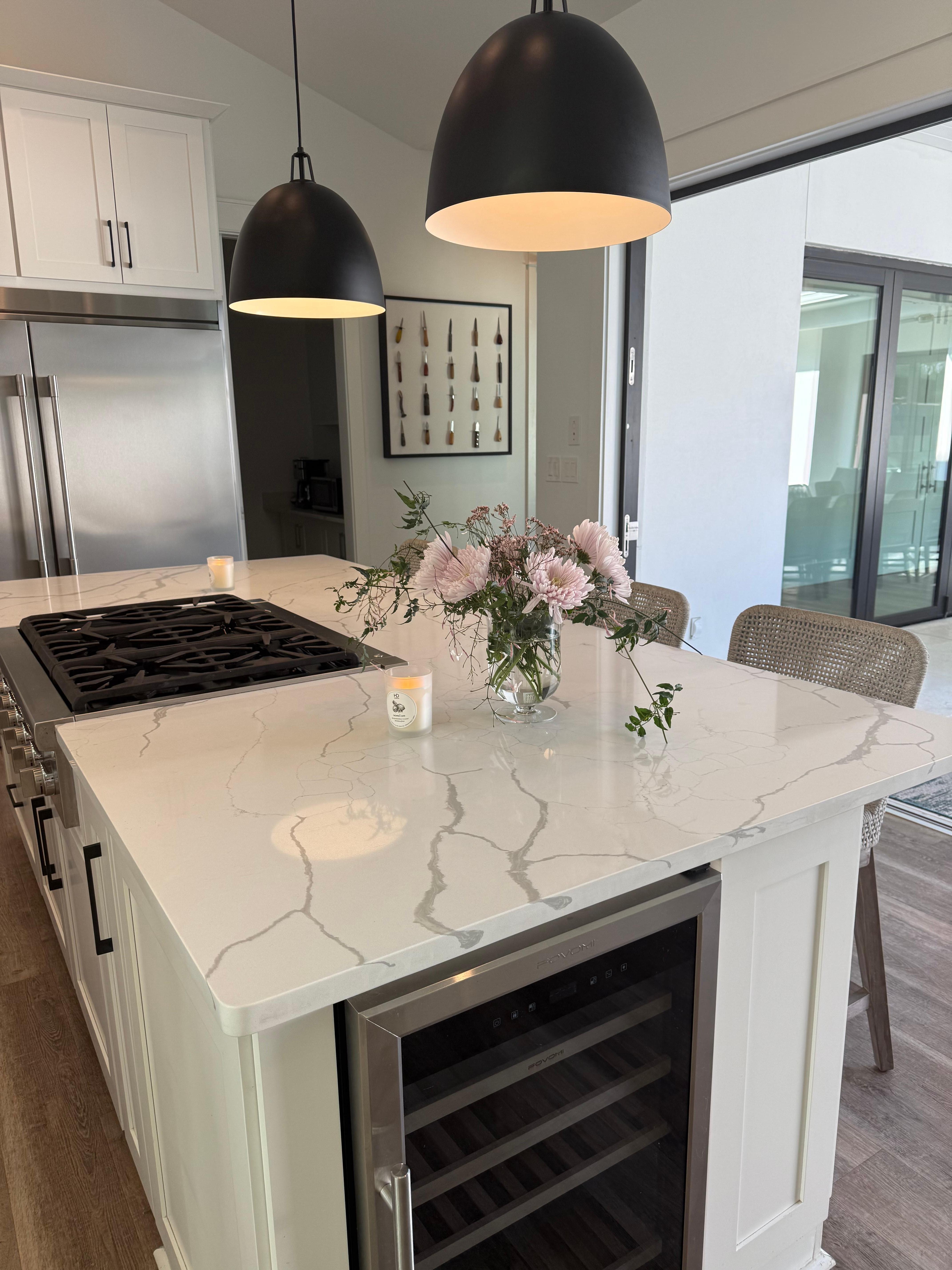 Adorned with plush furnishings, a cozy fireplace, and a large TV, the living space has a generous seating area. Family will also gather around the expansive quartz island countertop that seamlessly connects the living room to the impressive chef’s kitchen. With top-of-the-line appliances, which includes a 6-burner gas range, double wall ovens, two dishwashers, and an oversized fridge, the kitchen is a culinary delight.