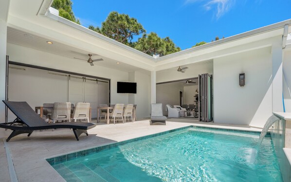 The tranquil oasis of the private pool out back will sure to be a vacation highlight! Step into luxury, where the whole family can unwind in style. The courtyard and pool, with spacious table and chairs, is accessible from multiple points within the home, inviting cherished moments of togetherness.