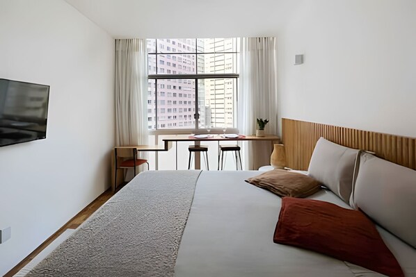 Modern, cozy, and very well-lit studio in Copan. The space features a super comfortable bed, quality linens, and a clean decor with wooden details that make the space even more welcoming. The wall-mounted Smart TV optimizes the space, and the counter by the window, with stools, is perfect for meals or work. A practical, elegant space designed for those seeking comfort and convenience in the center of São Paulo.
