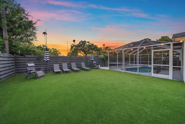 Step outside to discover a private yard with outdoor seating, ideal for enjoying the beautiful Florida weather. One of the standout features of Kiwi Cove is its private Heated pool, perfect for a refreshing dip on sunny Florida days.