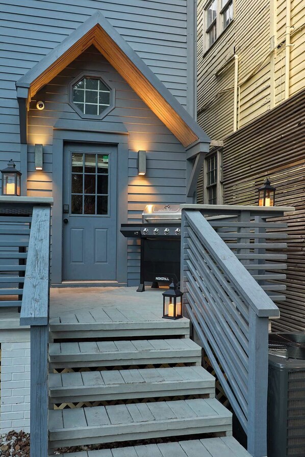 Private outdoor area featuring a seating space and charcoal grill, ideal for relaxing or enjoying casual outdoor meals.