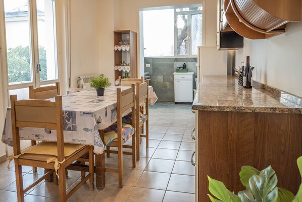 Description: large four-room apartment on the first floor of a small building. Entrance on bright living room with sofas and TV - welcoming kitchen with dining table, washing machine and balcony - bedroom with double bed - second bedroom with double bed - bedroom with two single beds - bathroom with shower cubicle.