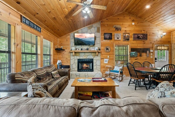 Mama Bear is the perfect blend of comfort, fun, and mountain charm! Kick back for a cozy movie night or catch the big game in the living room, all while enjoying the warm glow of the fireplace. Challenge your crew to a few rounds on the arcade games or share laughs and stories on the spacious, covered deck surrounded by trees. Sip your morning coffee while taking in the fresh mountain air, then end the day with a relaxing soak in the hot tub. And when it’s time to eat, fire up the BBQ grill and enjoy a laid-back cookout in the great outdoors.