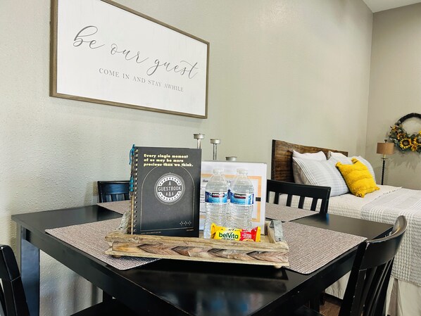 We make checkout a breeze with one rule: Please wash dishes and put away or leave on drying mat provided:)