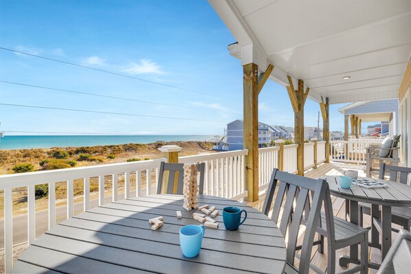 Front Upper deck: Sunrise Ocean view opens to Kitchen and Living room with coffee tables and high rocking Adirondack chairs