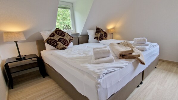 Nice view !This well-equipped 2-room apartment on the 1st OG. for 4 visitors lies in the district St. Peter-Böhl. In addition to the bedroom with 2 single beds you will find a double wardrobe bed in the living area. The bathroom is bright tiled and the nice large kitchen is u. a. equipped with a 4-plate stove and an oven. From the south-west-balcony you have a nice view. Parking on the property. Living room: couch, coffee table, 2 armchairs, stool, table lamp, night storage, wardrobe, double wardrobe bed, TV cabinet, cable TV, flat screen, telephone, clock radio, dining table, 4 chairs, kitchenette, 4 ring stove with oven, extractor hood, refrigerator, microwave , Coffee machine, tea kettle, toaster, hand mixer, iron, hoover, dishes, cooking potsBedrooms: 2 single beds, 2 bedside tables, wardrobe, night storageBathroom: shower, washbasin, toilet, stool, shower cabinFlur: In the stairwell are cloakroom and mirrorLocation: south-west facing, 1. Upper floor, district Böhl, beach 800 m, bakery 100 m, railway station 2.5 km, shopping 2,5 km, bicycle rental 200 m, swimming pool 6 km, health resort 6 kmPitching space: carport on the property, No. 3Linen: Bed linen and Towels can be booked for an additional fee with extra services, from 7 nights bed linen is included Pets: not allowed Arrival: On arrival between 15 30 and 17 00 o'clock Departure: On departure day until 10 o'clock