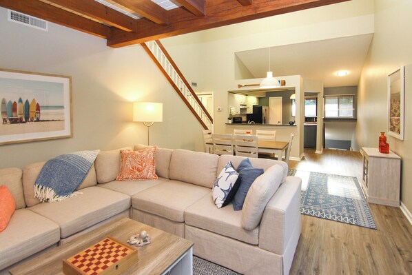 Spacious, light and completely refreshed condo, with tasteful, brand new furnishings, with two king bedrooms with en-suite bathrooms – Enjoy your morning coffee on the fresh-air screened porch or relax and read or nap in the comfy air conditioned sunroom’s overstuffed chairs. The airy, open, and bright loft space is outfitted with a daybed and trundle that sleeps an additional two and a nice desk that offers a work station for either an adult work space or child's desk. The updated high-end kitchen opens to the living and dining space, with half bath in the main entertaining area. Lots of closet space. Two bicycles provided for riding the miles of beautiful, meandering trails marked by live oaks, coastal hanging Spanish moss and marsh views that follow nine holes and a putting green.