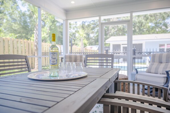 Screened Porch: Casual dining for six, perfect for sunrise coffee or sunset cocktails