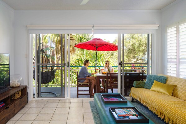 The open plan living room features a comfortable 4-seater lounge, an inviting occasional chair, air-conditioning, and a smart TV, that seamlessly opens out to the balcony.